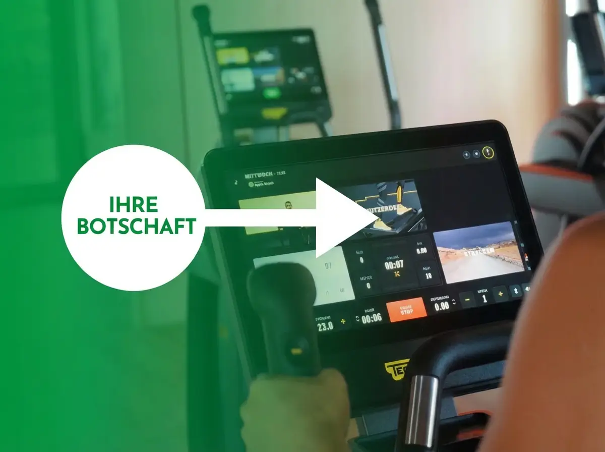 Nutzen Sie die einzigartige Möglichkeit, Ihre Botschaft direkt in den Alltag von Fitnessbegeisterten zu integrieren. Auf über 270 Geräten (228 Cardio und 42 Kraftgeräte) wird Ihre Werbebotschaft dynamisch, modern und zielgerichtet präsentiert. Zusätzlich können Firmen über die Geräte gezielt Personal suchen und so die Reichweite der Werbemaßnahmen optimal nutzen. Setzen Sie auf maximale Aufmerksamkeit in einem aktiven Umfeld, wo Markenbindung spürbar wird.